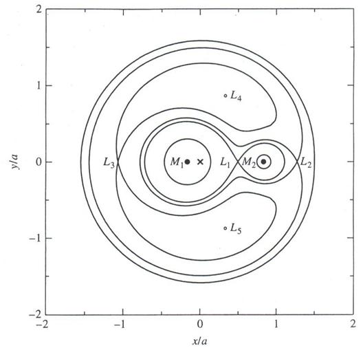 为常数的曲面称洛希等势面。共有5个作用力平衡的点,称拉格朗日点。其中