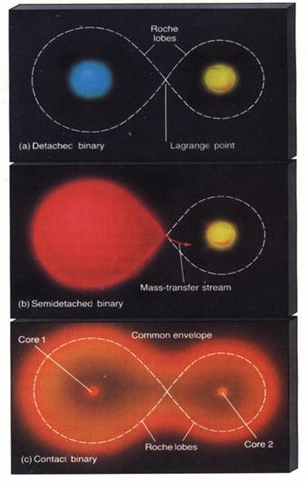 ![]() 密近双星的分类, 从上到下为:1)分离型,2)半接型,3)相接型 |