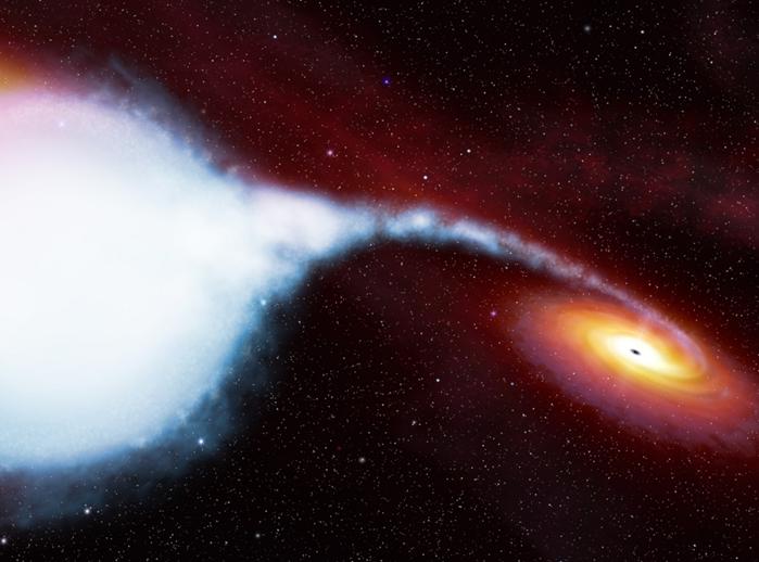 逃逸到另一个子星。对两星的公共质心而言,由于这部分物质携带角动量,到另一个子星附近就形成吸积盘。