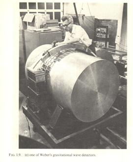![]() 韦伯 (T. Weber)1960年代建造的引力波探测器。大量压电换能器贴在圆柱体的中间。在运行时,探测器置于一个真空容器之中 |